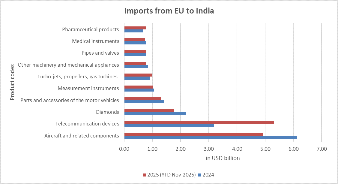 India and EU are touted as natural trade partners witnessing exports from India of around USD 79 bn. and USD 67 bn. during 2024 and 2025 (year-to-date November 2025) respectively and imports into India of about USD 58 bn. and USD 60bn. respectively during 2024 and 2025 (YTD), fetching India a trade surplus of around USD 20bn. in 2024 and USD 7 bn. in 2025 (YTD). The table below shows how exports from India to EU in value terms in the top 20 HS-4digit headings account for more than 55% of total value of exports comprising of 1100 plus headings. At the same time, one witnesses reciprocal exports and imports under same heading hinting towards close cross-border supply chain integration ex-ante between these partners. A graphical representation of top 10 products exported from India and imported from EU is presented below.