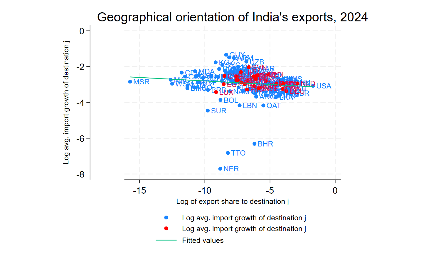 It is important to assess the orientation of India’s exports and the extent to which they are directed toward partners experiencing faster import growth, which serves as a proxy for economic growth. The following scatter plot depicts the log of India’s export share to its various destination partners (say j) along x-axis and corresponding log of average import growth of these partners along y axis. The figure shows a downward sloping fitted line (in green) suggesting India’s exports tilting towards slow-growing but economically significant developed economies including EU (EU countries differentiated by red dots).