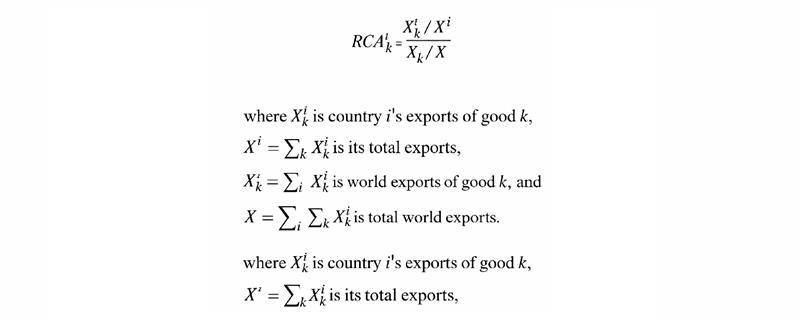 Comparative advantage describes a country’s ability to produce a good at a lower opportunity cost relative to its trading partners, which forms the basis for specialisation and mutual gains from trade. Since opportunity costs are not directly observable, the Revealed Comparative Advantage (RCA) index was devised by Balassa[4], which infers comparative advantage from trade patterns by comparing a product’s share in a country’s exports to its share in world exports. The index is formulated as follows: